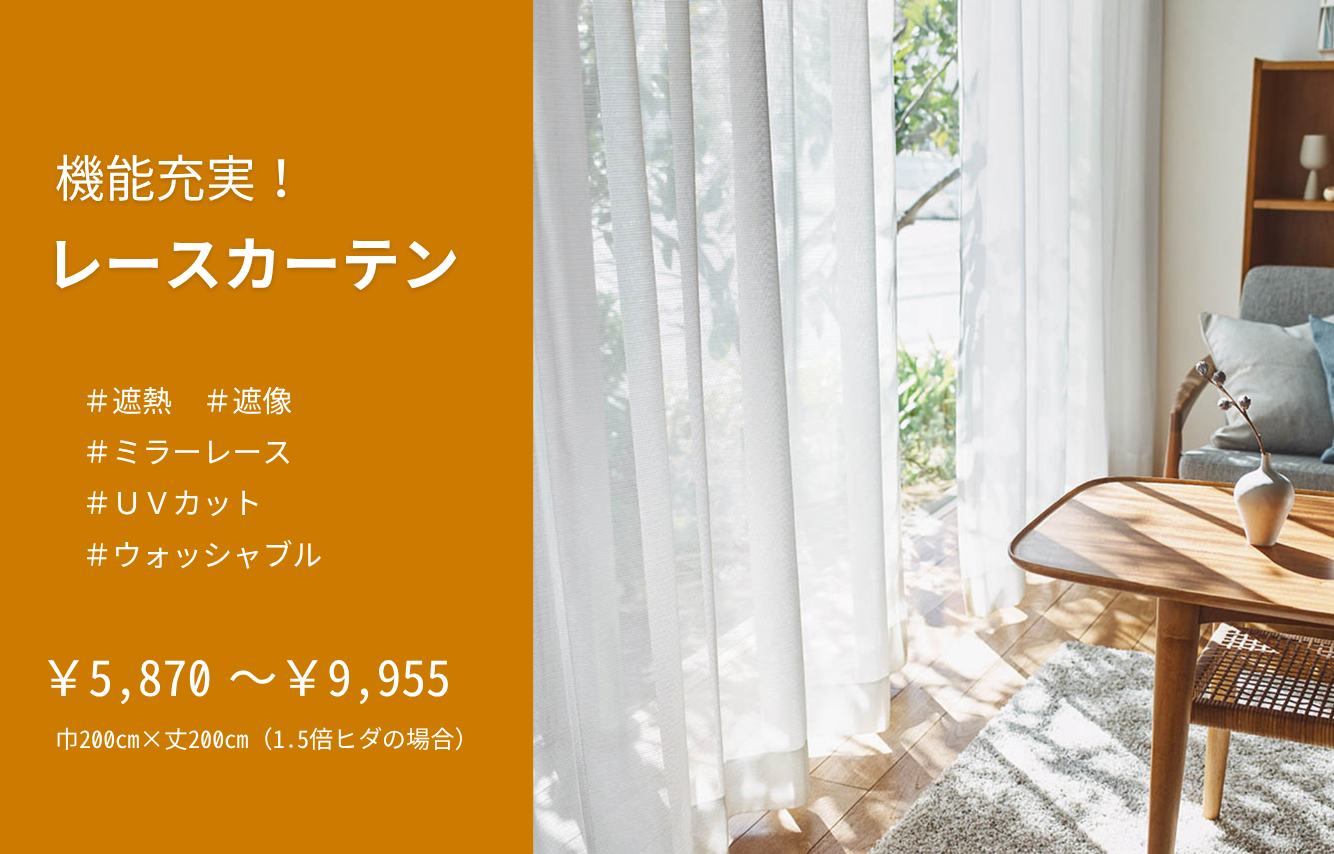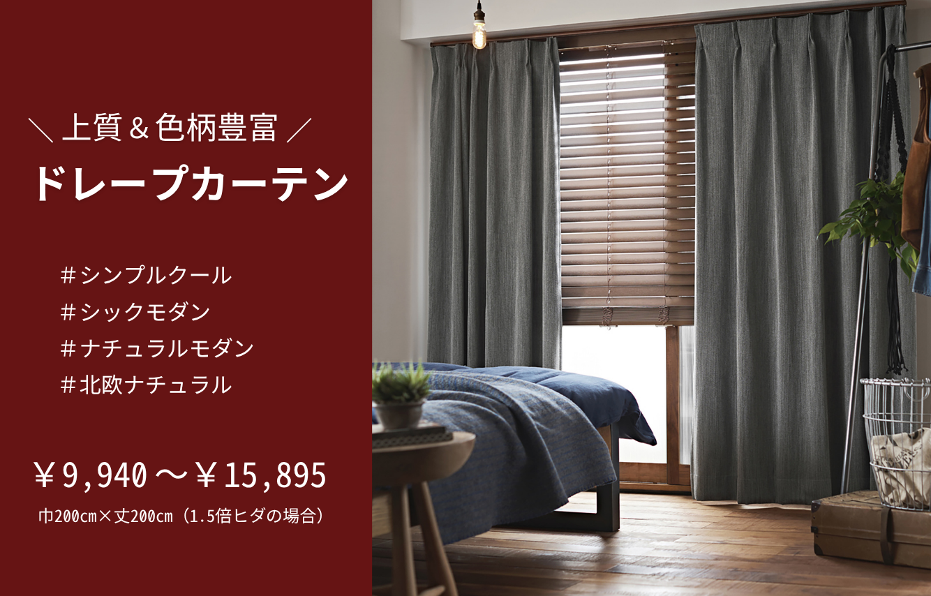 新着情報 2025.12.16 【2026年1月19日】システムメンテナンスのため、一部決済利用不可のお知らせ 2025.12.16 【初めての方へ】カーテンの料金体系について 2025.12.02 年末年始休業のお知らせ おすすめ特集 新生活応援セット 無地調の遮光ドレープカーテンと機能性レース(遮熱ミラー/遮像)のセット商品。好みの色をさっと選んですぐにプライバシーを守りたい方に。 おトク!お買い得品 遮光ドレープと遮像レースをラインナップ。おトクで良い商品をご用意しました。 安心の遮光カーテン! シャッターがないお部屋のプライバシーを守ります。夏は日差しをカットし、冬は保温効果も! やっぱり無地が好き! 豊富なカラーバリエーションと生地感からお選びいただけます。 シンプル&クール すっきりとしたデザインと上質感でさりげなくスタイリッシュなインテリア空間に。 ホテルライクなモダン空間 落ち着いた大人のモダンインテリアにおすすめのカーテンをラインナップしました! 心安らぐナチュラルデザイン やわらかな質感や優しい風合いで、ほっと心が安らぐナチュラルインテリアにおすすめ!