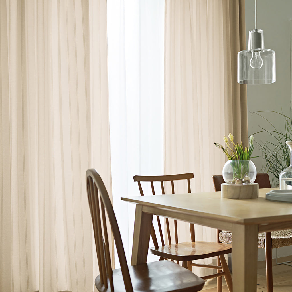 ヒダ山を3つ取り、レール寸法に対して約2倍の生地を使用します。ゆったりとした曲線の美しいドレープが高級感を演出します。生地の重なりが多いため、保温性が上がります。