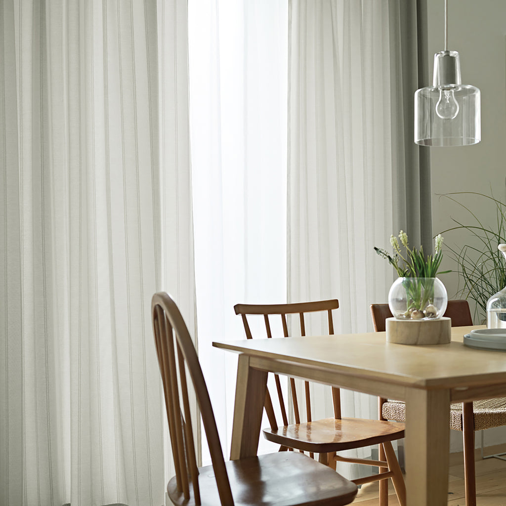 ヒダ山を3つ取り、レール寸法に対して約2倍の生地を使用します。ゆったりとした曲線の美しいドレープが高級感を演出します。生地の重なりが多いため、保温性が上がります。