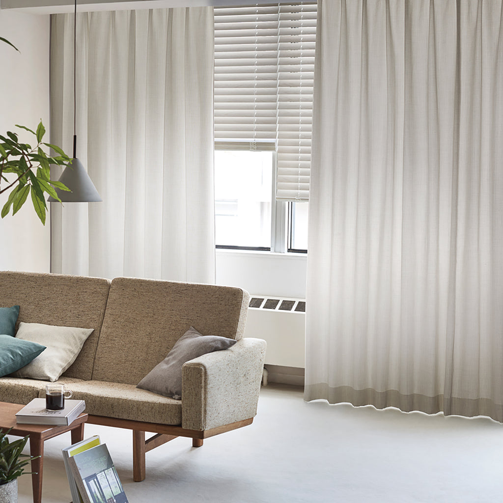 ヒダ山を3つ取り、レール寸法に対して約2倍の生地を使用します。ゆったりとした曲線の美しいドレープが高級感を演出します。生地の重なりが多いため、保温性が上がります。