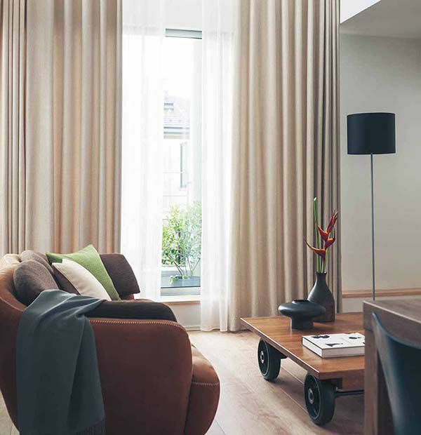 ヒダ山を3つ取り、レール寸法に対して約2倍の生地を使用します。ゆったりとした曲線の美しいドレープが高級感を演出します。生地の重なりが多いため、保温性が上がります。
