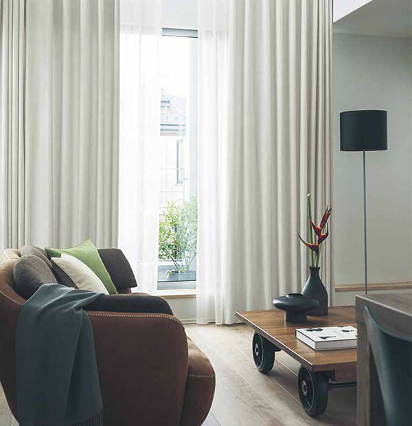 ヒダ山を3つ取り、レール寸法に対して約2倍の生地を使用します。ゆったりとした曲線の美しいドレープが高級感を演出します。生地の重なりが多いため、保温性が上がります。