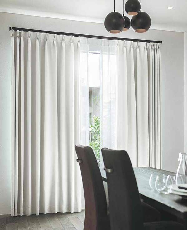 ヒダ山を3つ取り、レール寸法に対して約2倍の生地を使用します。ゆったりとした曲線の美しいドレープが高級感を演出します。生地の重なりが多いため、保温性が上がります。