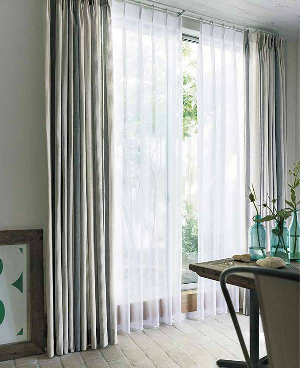 ヒダ山を3つ取り、レール寸法に対して約2倍の生地を使用します。ゆったりとした曲線の美しいドレープが高級感を演出します。生地の重なりが多いため、保温性が上がります。